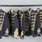 A group of early 20th century officer's dress tunics with bullion-embroidered decoration and rank insignia to the cuffs, some with trousers, together with a Royal Irish Rifles astrakhan dress busby, within a tin case, and a group of other mid-20th century dress busbies, one detailed with the badge of the Royal Regiment of Fusiliers.