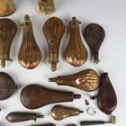 A large collection of 19th century powder and shot flasks, including a group of examples with embossed decoration, a group of pistol-type examples and a leather-bodied example, marked 'Boche Leur à Paris', together with a brass and wood-handled powder measure.