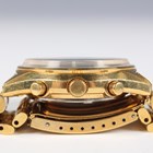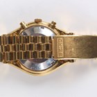 A Seiko Chronograph Automatic gilt plated steel gentleman's bracelet wristwatch, Ref. 6138-8020, circa August 1976, with signed and jewelled 6138B caliber movement, the signed black dial with gilt baton hour markers, two subsidiary dials and day and date apertures, the signed case back detailed '6138-8020' and numbered '681215', the original Stelux bracelet with signed foldover clasp, case diameter 4.1cm.