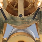 A late 20th century John Harrison replica gilt brass grasshopper escapement 'Sea Clock' timepiece, the eight day single fusee movement with two oscillating dumbbell pendulums, the arched skeleton case detailed 'The Grasshopper Clock', with enamelled chapter ring below enamelled arched Arabic subsidiary seconds dial, on a slate rectangular plinth base, height 44cm (lacking cover).