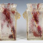 A pair of pale amber tinted crackle or ice glass vases, probably French, early 20th century, of rectangular shape with cranberry and gilt striated detail, flanked by lion mask handles, unmarked, height 25.5cm (faults), together with a pair of dark glass vases with a fine crackled petrol blue iridescent surface, height 26cm, and a matching smaller example, height 23cm. Provenance: from the collection of John and Poppy Stallebrass.