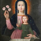 Italian School – Madonna di Re (Madonna del Latte), late 17th/early 18th oil on canvas, 72cm x 57.5cm, within a gilt frame. Note: the iconography of this Nursing Madonna corresponds to a specific event in the history of the Santuario della Madonna del Sangue Basilica in Re, Piedmont, Italy. On 29th April 1494, a group of young people met in front of the Church of San Maurizio to play a traditional village game, piodella, which consisted of throwing a flat stone against a wooden cylinder on which a coin was placed. One of them, particularly unlucky in the game, became angry and threw his stone, striking a ‘Madonna del Latte’ fresco on the facade of the church. The following morning the fresco of the Madonna began to bleed from her forehead.