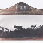 A set of four Edwardian silver and paper silhouette menu holders of rectangular form, each glazed with a silhouette depicting a different hunting scene bearing monogram, beneath a shaped top engraved with initials, supported by a wirework back, London 1909 by Elkington & Co Ltd, length 8.5cm.