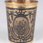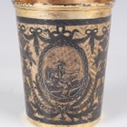 An early 19th century Russian silver gilt and niello beaker, 84 zolotnik, of slightly tapered cylindrical form, finely decorated with three oval figural panels supported by swags and divided by urns and baskets on an engraved ground, Moscow 1804, assay master Ivan Vilayov, weight 166.8g, height 9.6cm.