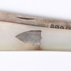 A group of five silver and mother-of-pearl folding fruit knives, unopened lengths ranging from 7.5cm to 8.3cm, together with another mother-of-pearl mounted folding fruit knife with silver and steel blades, length 7.8cm.