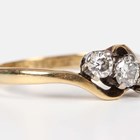 A gold, platinum and diamond three stone ring in a crossover design, detailed ‘18ct Plat’, weight 2.2g, ring size approx N1/2.