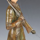 An Art Deco green patinated cast spelter figure group of a country lady holding a rifle, accompanied by two setters, raised on a slate and alabaster base, width 62cm.