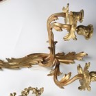 A pair of 19th century Rococo Revival ormolu twin-light wall sconces, height 38cm, together with a pair of brass diminutive easels, height 30cm.