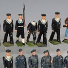 A collection of Britains lead figures, including RAF personnel, despatch rider, two firefighters, navy personnel, field gun and limber (some paint chips and faults).