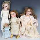 A bisque head and shoulders doll, probably Heubach, impressed with a horseshoe and '1902 10/0', with blonde wig, sleeping blue eyes and kid body, height 34cm, together with three other German bisque socket head dolls with jointed wood and composition bodies, heights 37cm, 32cm and 15cm, all clothed, and a collection of dolls' clothes.