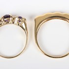 A gold ring, claw set with three oval cut amethysts alternating with two pairs of circular cut diamonds, indistinct mark, weight 2.8g, ring size approx L, and a Middle Eastern gold and colourless gem set ring in an undulating design, weight 3.6g, ring size approx R1/2.