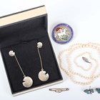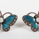 A small group of jewellery, comprising a pair of rose cut diamond, seed pearl and enamelled butterfly earstuds, unmarked, width 1.2cm, a single row necklace of cultured pearls on a diamond set clasp, length 54cm (one diamond lacking), a bar brooch, mounted with a baroque pearl (pearl drilled), a pair of Links of London silver lily pad pendant earrings, with a case, and a George III crown, the reverse enamelled and mounted as a brooch.