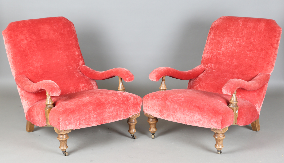 A pair of modern Victorian style deep seated armchairs, upholstered in pink velour, on turned oak legs, height 82cm, width 64cm, depth 103cm.