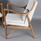 A pair of modern reproductions of the Finn Juhl 45 armchair, the ash frames supporting upholstered seats and backs, height 83cm, width 72cm, depth 76cm.
