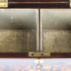 A late Victorian Tunbridge ware tea caddy, the hinged lid with a mosaic view of the Solar and Buckingham Buildings at Penshurst Place, the waisted sides with a border of flowers, width 24cm.