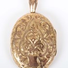 A Victorian yellow metal oval pendant locket with palmette and scroll decoration, unmarked, weight 12.2g, length 5.7cm