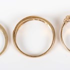 A 9ct gold ring in a beaded and interwoven keeper design, indistinct marks, ring size approx P1/2, a 9ct gold and diamond nine stone ring in a twist design, and a 9ct gold and diamond half eternity ring, total weight 6.8g.