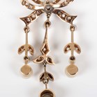 A gold backed, diamond and pearl pendant necklace, the front designed as a tied bow with three pendant drops, with a trace link chain on a snap clasp, unmarked, weight 8.3g, principal diamond weight approx 0.65ct, length 40.5cm (pearls untested), with a case.