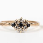 A gold, blue zircon and diamond cluster ring, claw set with a circular cut blue zircon within a surround of eight old cut diamonds, unmarked, weight 2.2g, ring size approx J1/2, a white metal and diamond ring, mounted with the principal old cut diamond between diamond three stone shoulders, unmarked, weight 1.7g, and a 9ct gold, sapphire and colourless gem set cluster ring, weight 1.6g.