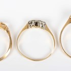 A gold and diamond ring, mounted with four diamonds, detailed ‘18ct’, weight 2g, ring size approx K1/2 (one diamond lacking), a gold, platinum, sapphire and colourless gem set cluster ring, detailed ‘Plat 18ct’ (central gem lacking), and a gold and platinum ring, mounted with two diamonds, detailed ‘18ct & Plat’ (central gem lacking), total weight 2.8g.