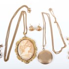 A pair of 9ct gold, sapphire and colourless gem set pendant cluster earrings, length 1.6cm, a pair of gold, half-pearl and citrine pendant earrings, detailed ‘9ct’, total weight 4.1g, another pair of earrings, a 9ct gold circular pendant locket with a gold neckchain on a boltring clasp, detailed ‘9’, weight 4g, and a gilt metal mounted shell cameo pendant with a neckchain.