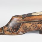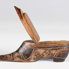 A mid-Victorian mahogany novelty shoe snuff box with brass line and stud decoration, the sole dated '1876', length 10cm, together with another similar snuff box, the lid inset with a carved bone portrait, length 13cm.