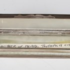 A 19th century white metal and mother-of-pearl oval snuff box, width 7cm, together with a Regency white metal and engraved mother-of-pearl toothpick case, length 7.3cm.