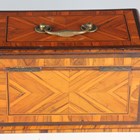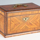 A good George III laburnum tea caddy, the hinged lid and sides quarter and radially veneered, the interior later fitted with a pair of cut glass decanters and stoppers, width 24cm.