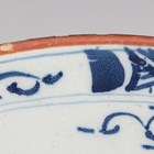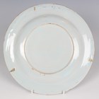 A blue and white delft plate, mid to late 18th century, painted in Chinese style with large flowering plants enclosed by a trellis fence, the rim with trellis sections and stylized flowers, diameter 22.8cm, together with two Chinese blue and white porcelain plates, 18th century, one painted with flowers, diameter 23.3cm, the other with a Chinese landscape, diameter 22.8cm (faults).