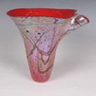 A Peter Layton studio glass vase, dated 1989, of flared form with pinched rim, the red interior showing through to the silvery iridescent exterior heightened with spots and striations of colour, engraved mark to base, height 20.3cm. Provenance: from the collection of John and Poppy Stallebrass.