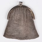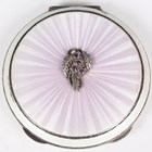 An Elizabeth II silver and lilac enamelled circular compact, the front applied with a foliate spray, Birmingham 1961, diameter 8.3cm, a Continental silver chain mesh evening purse, length 8.5cm, and a silver handbag mirror, together with a plated châtelaine clip and a plated lady's fob watch.