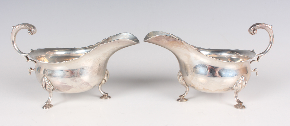 A pair of George V silver sauceboats, each with foliate capped scroll handle, on scallop shell shouldered scroll legs terminating in hoof feet, Birmingham 1911 by D. & M. Davis, total weight 468.3g, length 16cm.