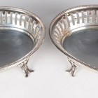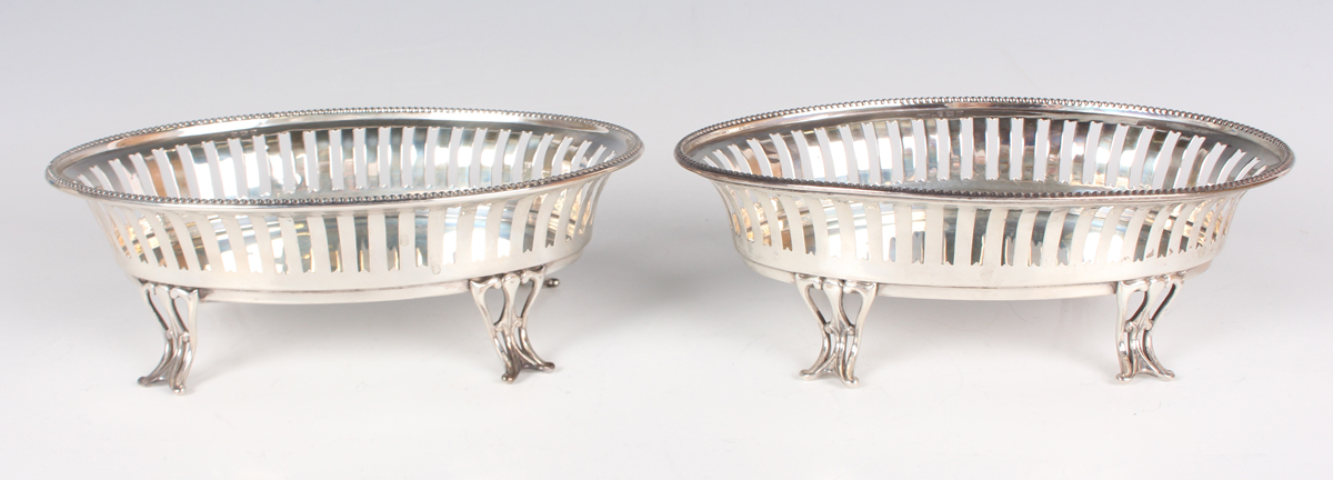 A pair of Edwardian silver oval baskets, each with pierced sides and beaded rims, raised on pierced scroll legs, Birmingham 1909 by W.G. Keight & Co, total weight 269.5g, length 18cm.