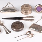 A group of silver, including an evening purse with engraved decoration and leather interior, Birmingham 1919, width 9cm, a circular trinket box, the hinged lid decorated with birds and scrolls, Birmingham 2000, diameter 8.6cm, and a hand mirror, Birmingham 1901, weighable items 149.5g, together with a .800 silver small cream jug, height 5.3cm, and a plated evening purse.