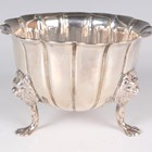 A George III Irish silver circular sugar bowl with vertical reeded sides and petal rim, raised on lion mask shouldered scroll legs terminating in paw feet, Dublin, no date letter, by Stephen Walsh, weight 187.1g, height 7.3cm.