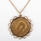 A George V sovereign 1913 in a 9ct gold pendant mount, length 3.1cm, with a gold neckchain on a boltring clasp, detailed ‘9K’, length 52cm, total weight 11.7g.