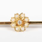 An 18ct gold, diamond and seed pearl bar brooch, the centre designed as a flowerhead shaped cluster, otherwise mounted with an old cut diamond at either end, London 1985, weight 4g, width 5cm.
