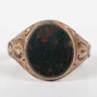 A 15ct gold hollow circular bangle, Chester 1925, weight 8.8g, inside diameter 6.5cm, a 9ct gold and bloodstone oval signet ring with engraved shoulders, partial marks, and a gold and gem set brooch, detailed ‘9ct’, total weight 4g.