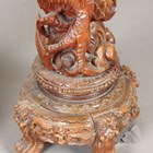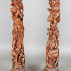 A pair of early 20th century Chinese carved wooden display pedestals, each stem modelled with a trailing dragon, raised on carved claw feet, height 140cm (some faults).