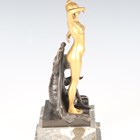 Theodor Eichler - The Slave's Destiny, an early 20th century German brown and gilt patinated cast bronze figure group of a seated slave trader beside a standing nude maiden, the base bearing cast signature, raised on a marble plinth, height 29.5cm.