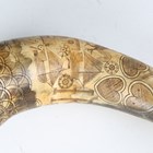 A 19th century engraved horn flask, decorated with overall hearts, ships and a church, length 31cm.
