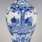 A Chinese blue and white porcelain vase and cover, mark of Kangxi but late 19th century, painted with birds, blossoming branches and flowers, underglaze blue four-character mark to base, height 27.5cm (chips to cover), together with a smaller similar blue and white vase and cover, height 21.5cm (cracked), and a Japanese Kutani circular jar and cover, Meiji period, painted with a landscape, diameter 11.2cm.