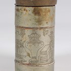 A pair of Japanese brown patinated bronze two-handled vases, Meiji period, each ovoid body cast with opposing dragons, on a circular foot, height 17cm, together with a pair of smaller bronze vases, height 15cm, and a water pipe (some faults).