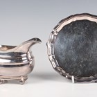 An Elizabeth II silver circular card salver with piecrust rim, on scroll feet, Sheffield 1959 by A. Chick & Sons Ltd, diameter 15cm, and a silver cream jug of cushion form, on ball feet, Sheffield 1967 by James Dixon & Sons Ltd, height 9.7cm, total weight 391.4g.