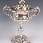 A 19th century Swedish plated sauce tureen and cover with flower finial, of lobed circular form, the rim decorated with acorns and oak leaves, flanked by two scroll handles, on a similarly decorated tapering stem and pierced domed foot, by A.G. Dufva, height 38cm, together with a Swedish plated bowl on a triform base, a plated ladle and a matching serving spoon.