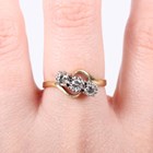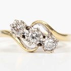 A gold and diamond three stone ring, mounted with circular cut diamonds in a crossover design, indistinct mark, weight 2.7g, ring size approx O/12.