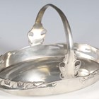 A Liberty & Co 'Tudric' pewter cake basket, model number '0359', width 23.5cm, together with an Arts and Crafts brass hot water jug, three pieces of Secessionist metalware and a Doulton stoneware swing-handled bowl.
