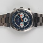 A Breitling Transocean chronograph stainless steel gentleman's bracelet wristwatch, Ref. 7102, circa 1971, with signed and jewelled Valjoux 7740 caliber movement, the signed blue dial with baton hour markers, date aperture, centre stop seconds and three white subsidiary dials, the case with two buttons to side, the signed case back detailed '7102' above '1381118', the tapered link bracelet with foldover clasp, case width 4.2cm.