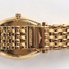 A Longines gilt metal lady's bracelet wristwatch, the signed tonneau shaped dial with black Roman numerals, the link bracelet with foldover clasp, case width 2.2cm, with original international guarantee card, dated '18.10.01', and Longines case.