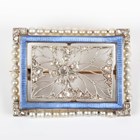 A gold backed, diamond, seed pearl and pale blue enamelled rectangular openwork brooch with a central diamond set floral motif within a pale blue enamelled border, otherwise with an outer border of seed pearls and rose cut diamonds, unmarked, weight 5.1g, width 2.7cm, with a case.